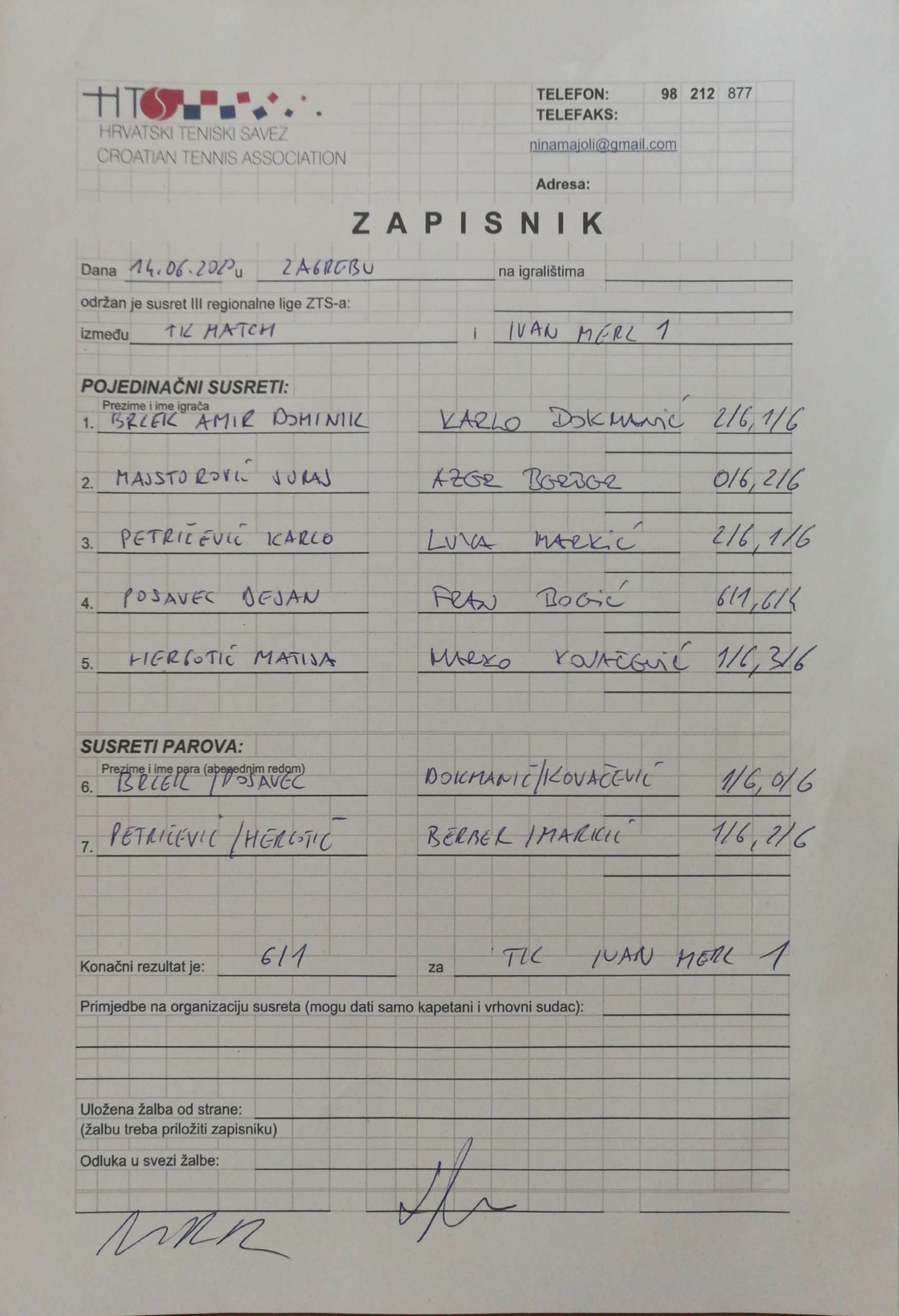 U 1.kolu 3.lige, skupine 3 TK Match na svojim terenima na Klaki ugostio je 1.momčad našeg kluba Ivan Merz. TK IMZ 1 pobijedili su sa 6/1, 4/1 u pojedinačnim i sa 2/0 u parovima. Susreti su protekli u prijateljskoj atmosferi i u idealnim uvjetima za igranje.